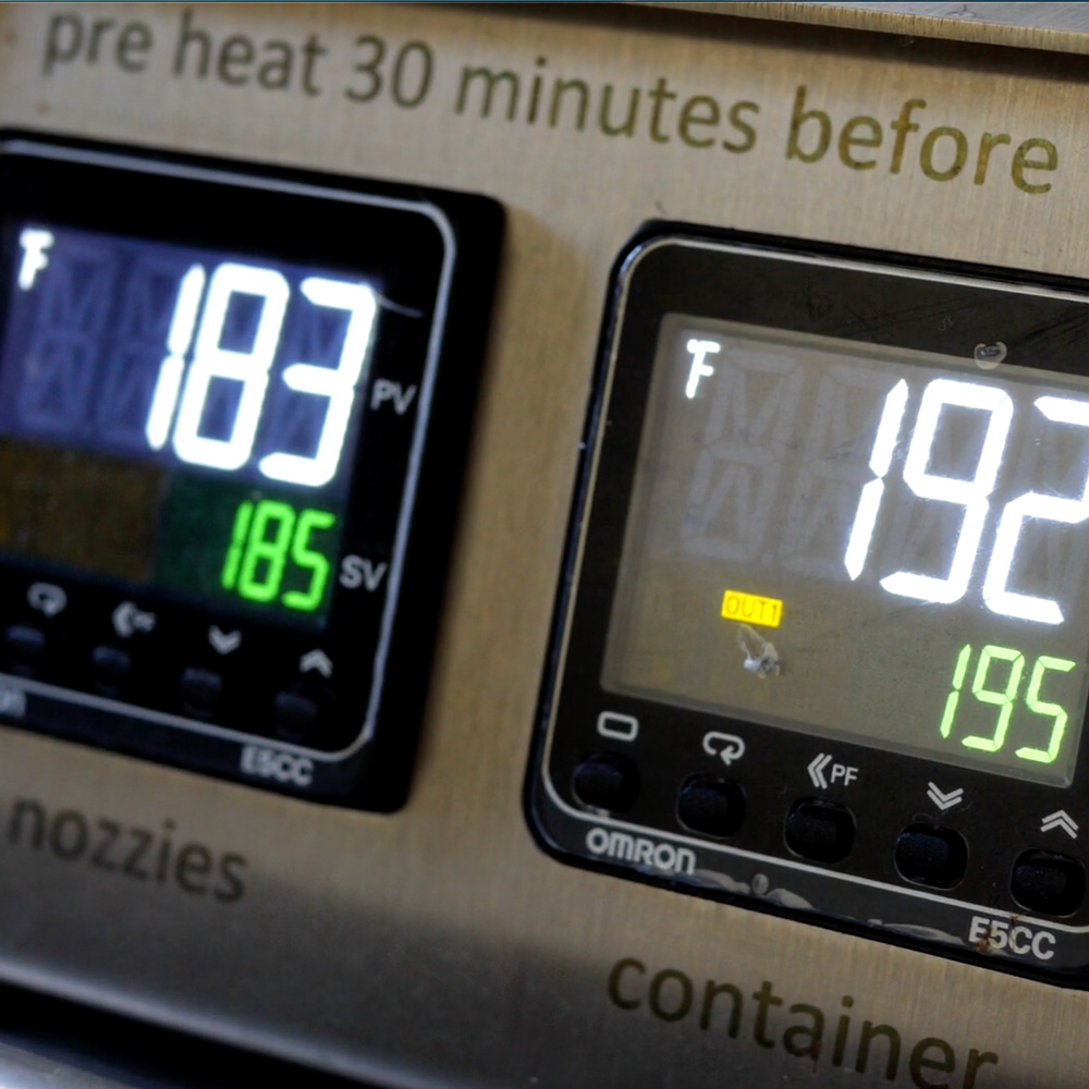 The Universal Candy Depositor comes with a full heating system and dual-zone digital control unit to regulate the temperature from 70F to 320F (21C to 160C),Ā 8 adjustable nozzles and aĀ 12 liters (3.2 gal) hopper.
