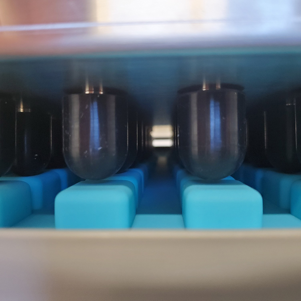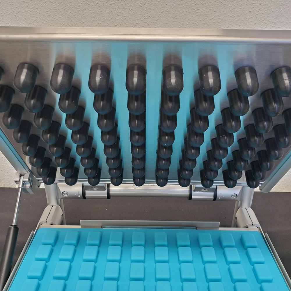The pin fittings can be added on the original pins of the Universal Candy Demolder to increase the diameter and improve efficiency of unmolding with larger cavity size molds such as Macaron 80, Petit Cube 80, Mini Square 80, or custom molds.