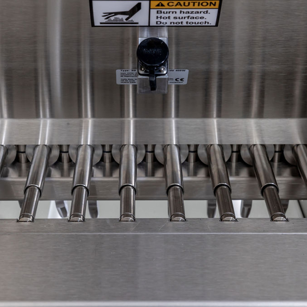 The 8 Pistons Semi-Automatic Candy Depositor for chocolate, gummy, taffy, caramel and hard candy is designed to work with all the Truffly Made silicone molds and most polycarbonate molds up to 11.5 inches wide, it delivers accurately metered fillings with great flexibility. Stainless steel construction with adjustable depositing nozzles that can be easily positioned to each mold layout. The Semi-automatic Depositor comes with a 12 liter Hopper and a complete heating system with temperatures ranging from 68F to 320F (21C to 160C).