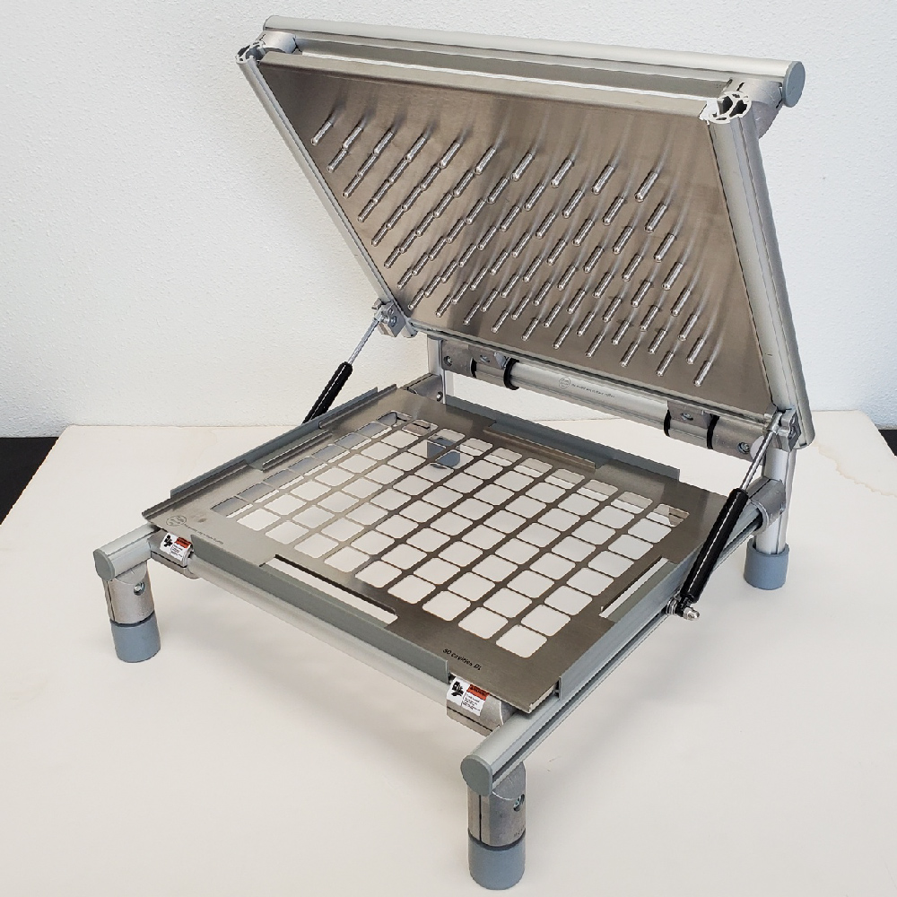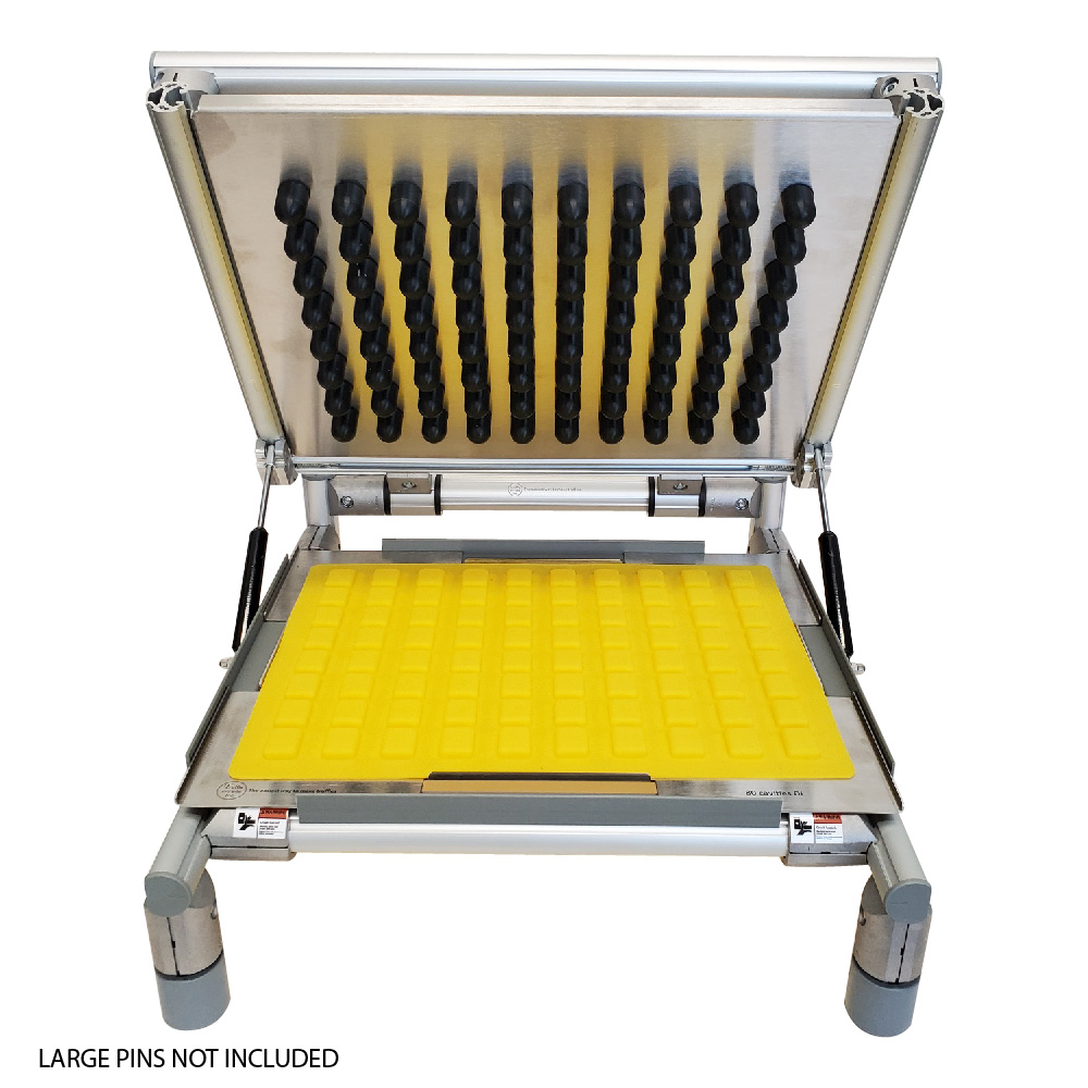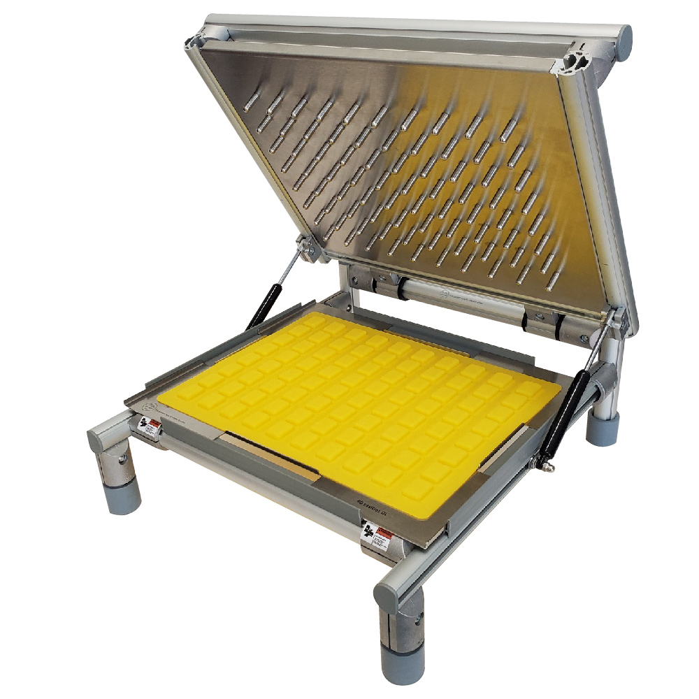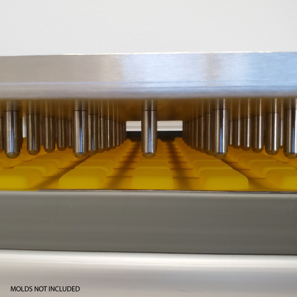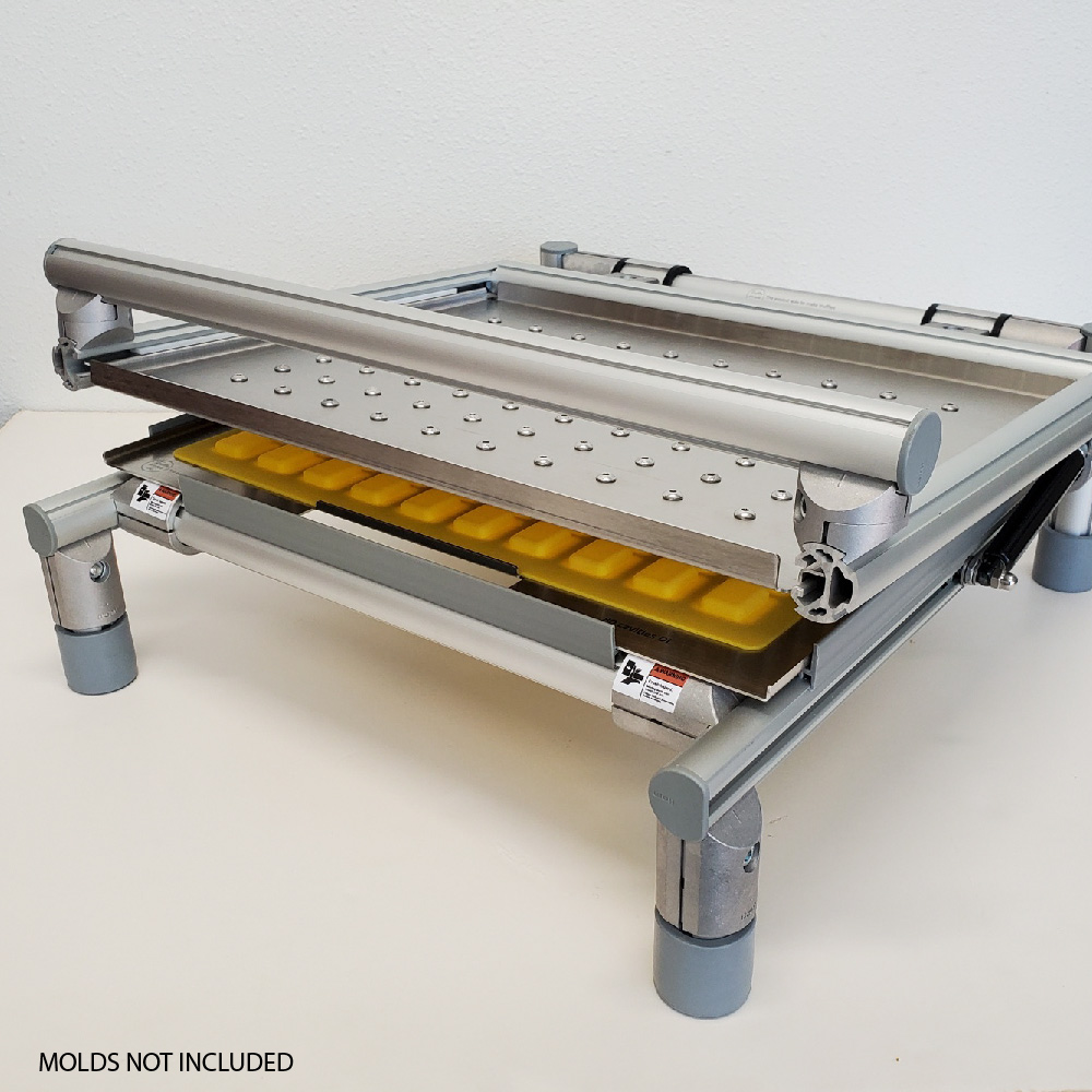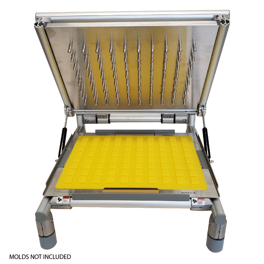 Universal Candy Demolder is designed to remove a full sheet of candies from molds in one “pop”. Demold your trays in second! Ideal for Hard Candies, Gummies, Caramels, Chocolate and Fruit Jelly! The mold “Popper” includes one standard mold frame to match the mold you are using. Please note that the mold is not included. Custom mold plates are available for additional 911 USD to work with your silicone molds.