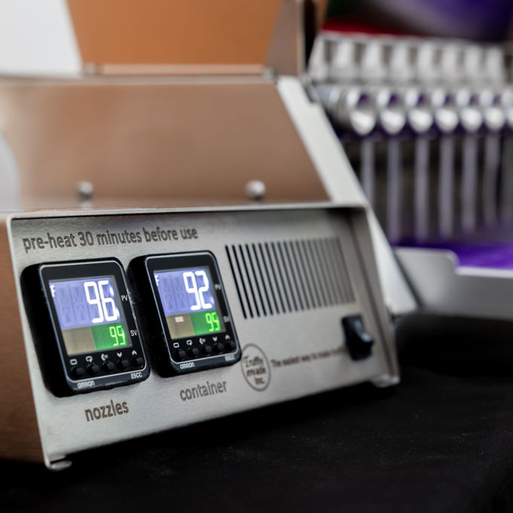 The Truffly Made, Universal Depositor For Gummies, Caramel, Hard Candy is designed to remove the burden of filling multiple cavity candy molds while increasing the accuracy and uniformity of filling each mold. It works with both low heat confectionery ingredients such as chocolate and ganache, as well as high heat candy ingredients such as caramel, gummies and hard candy. The Universal Candy Depositor comes with the hopper with heated panels.