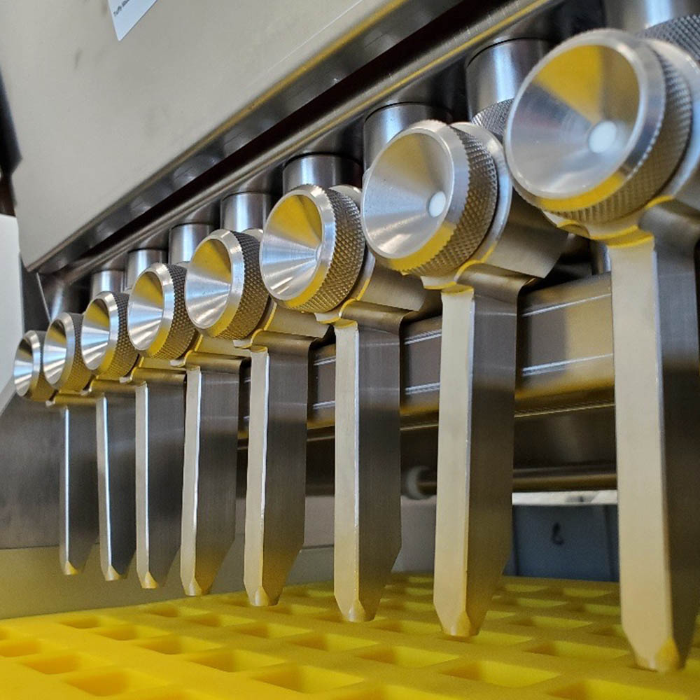 - Eight nozzles have adjustable centerlines to accommodate various mold configurations.